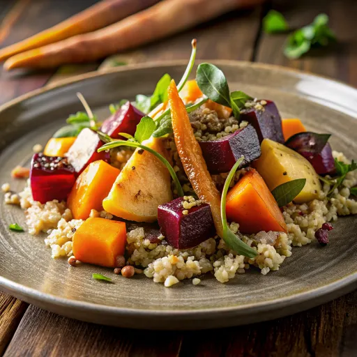 Renkli sebzeler ve zeytinyağı ile zenginleştirilmiş kepekli kinoa ile doğal bir lezzet yolculuğu.